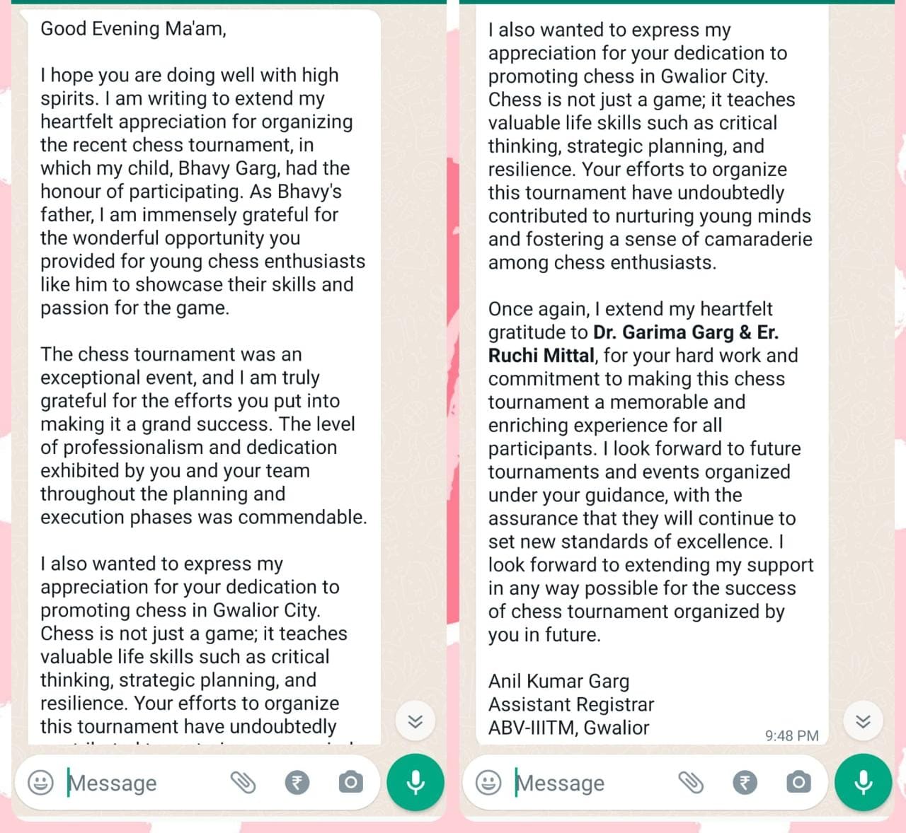 It was really a beautiful and well organised tournament. On behalf of Scindia School it's my heartiest congratulations to all of the persons related to this tournament for their successful completion of Tournament. Special thaks to Madam Garima, Mr. Manish, Mr. Rajesh and to Mr. Rupesh for their constant Encouragement to bring more students and to give them the opportunity to get the test of Win.”